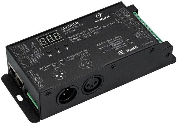Arlight SMART-K15-DMX (12-36V, 4x8A) Декодер DMX с дисплеем для управления светодиодными лентами, 4 канала, нагрузка 8А, размер 165x70x37 мм.