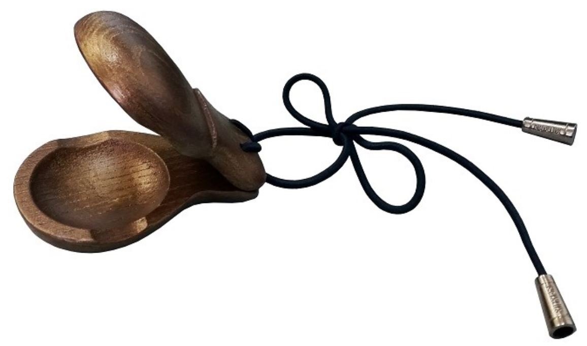 Как играть – завяжите дополнительную петельку из шнура, наденьте на средний, указательный (можно на два одновременно) или большой палец. Ритмический рисунок задается пальцами правой руки, кастаньета в левой руке – для подчеркивания ритма.