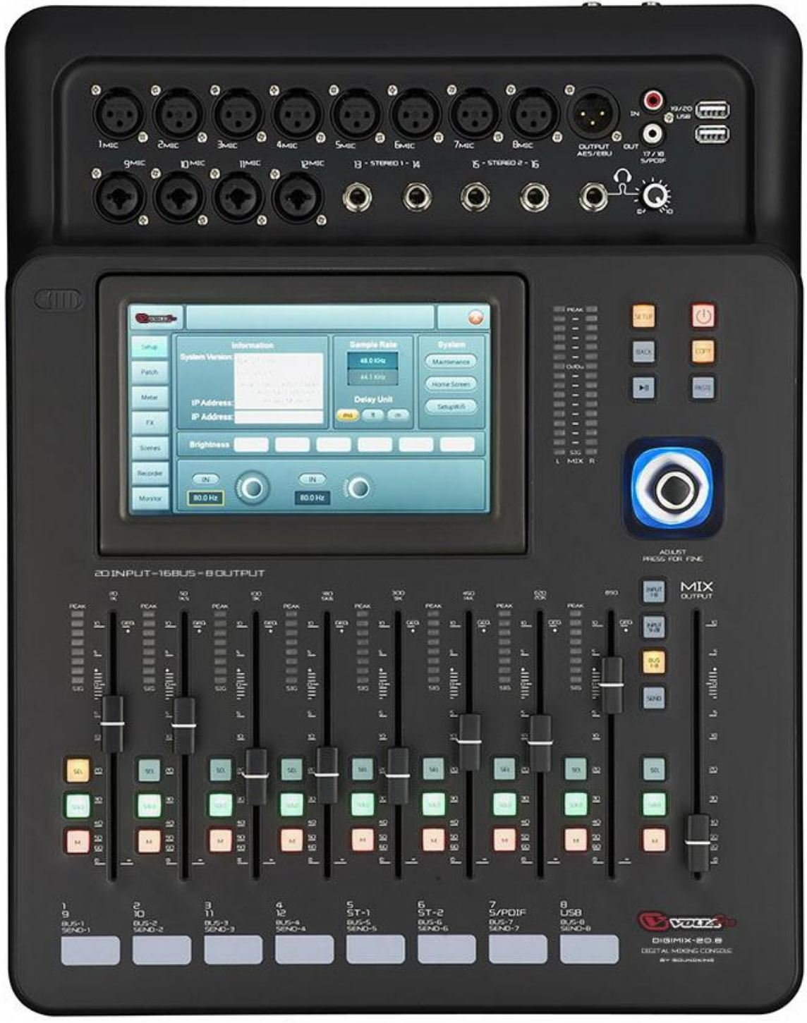 Микшер оснащён девятью моторизированными 100-миллиметровыми фейдерами (производства ALPS Electric, Япония), характеризующимися самым высоким рабочим ресурсом и надёжностью. Визуализация всех рабочих параметров доступна на 7-дюймовом IPS HD-тачскрине с разрешением 1024X600 точек.