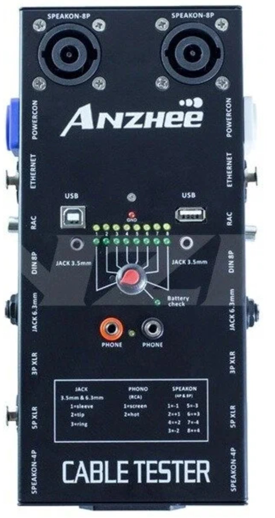 Anzhee Cable Tester Кабельный тестер POWERCON/ETHERNET/XLR 5pin/XLR 3pin/SPEAKON 4P/SPEAKON 8P/JACK 6.3mm/JACK 3.5mm/PHONE/ RAC/ DIN 8P/USB