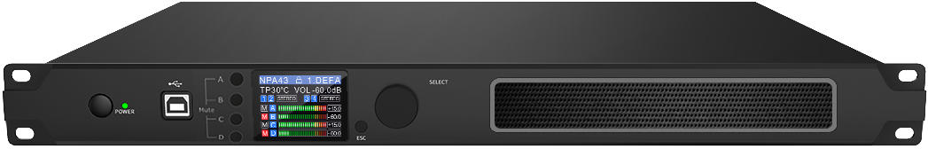 LORRENZ NPA43D усилитель 4-канальный, мощность (на канал): 500Вт•4Ω, 300Вт•8Ω, 2х500Вт 100V, процессор DSP, DANTE, USB, RJ-45 управление, 1U