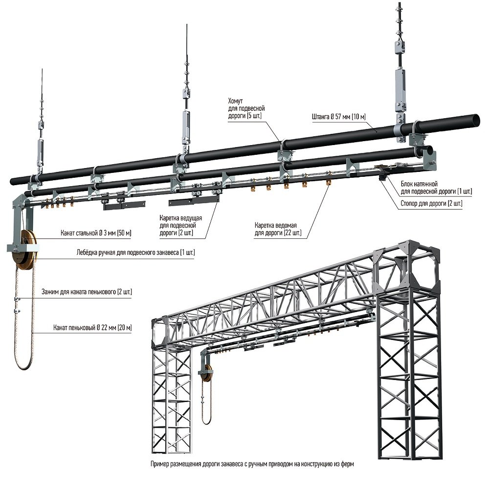 Конструкция дороги занавеса с ручным приводом специально разработана для подвеса к штангам декорационных подъёмов, а также для её крепления к металлоконструкциям павильонов.
