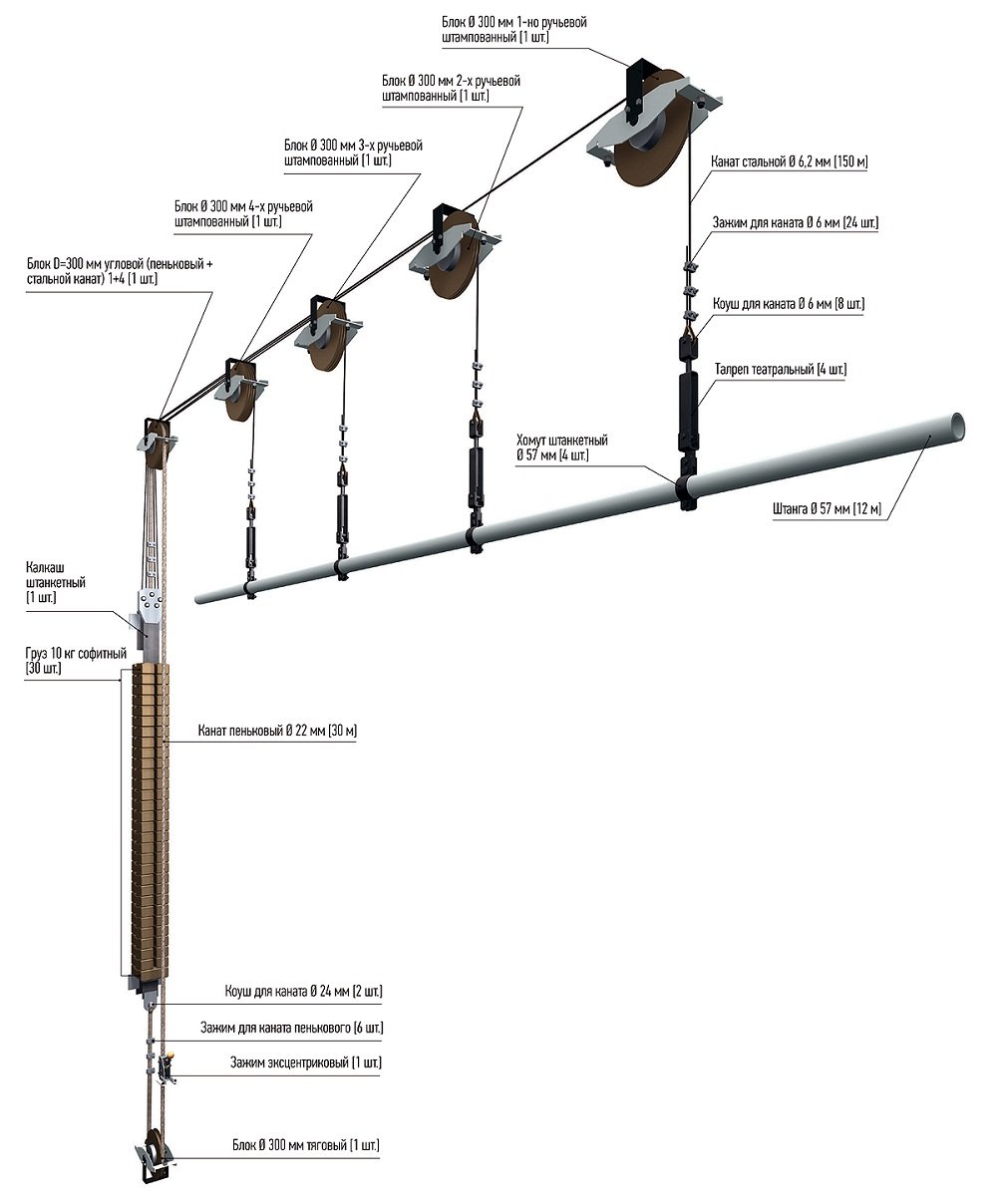 Канаты, огибая обводные блоки, крепятся к противовесу, который уравновешивает штангу декорационного подъёма.